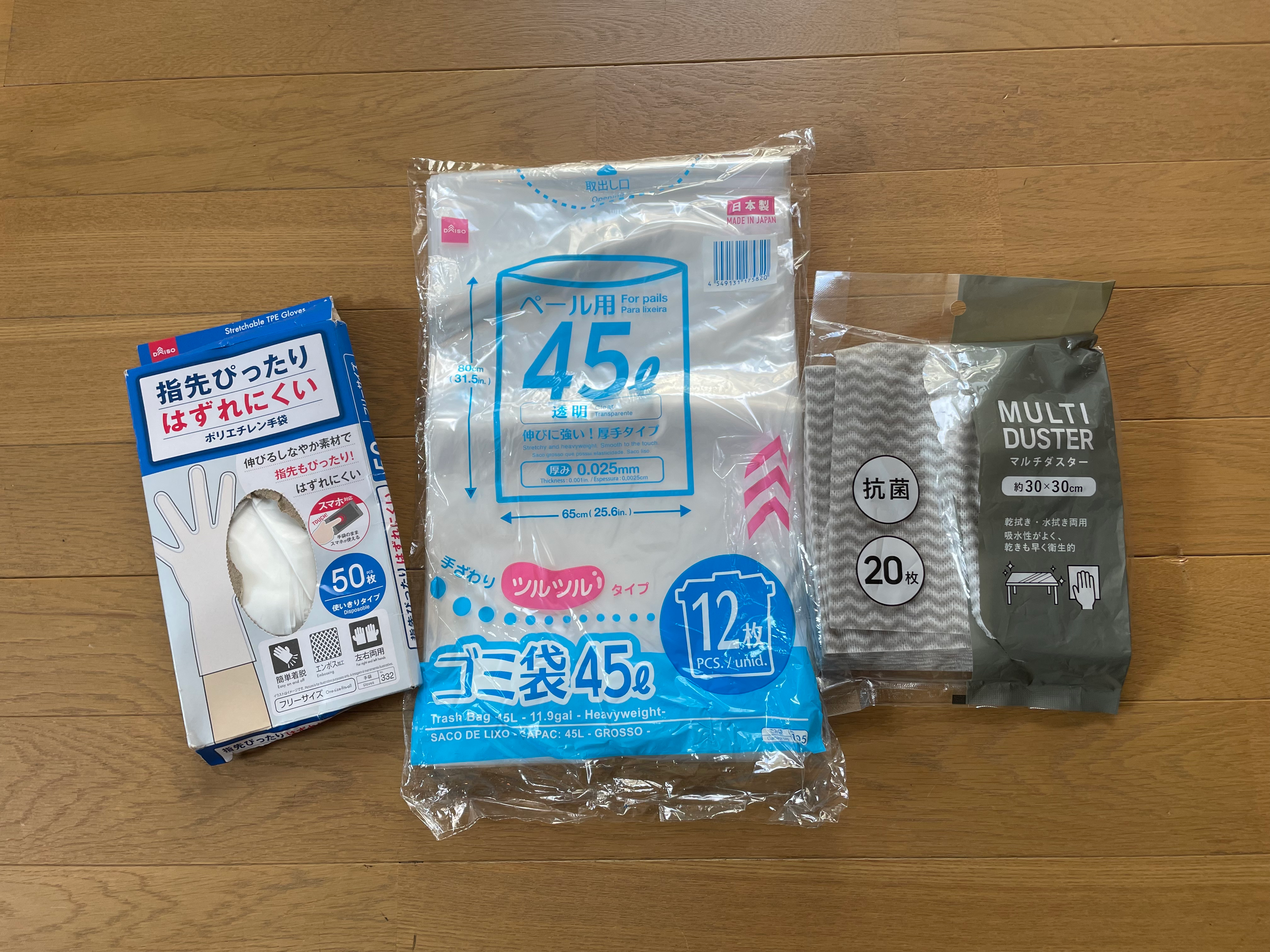 ゴミ袋、使い捨てクロス、ビニール手袋のセット